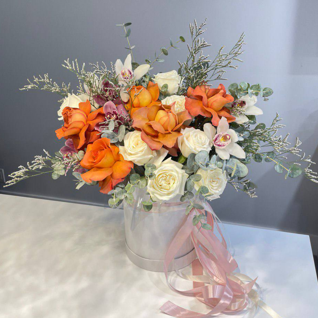 Fiery orange roses, creamy ivory blooms, and exotic orchids in a modern hat box.